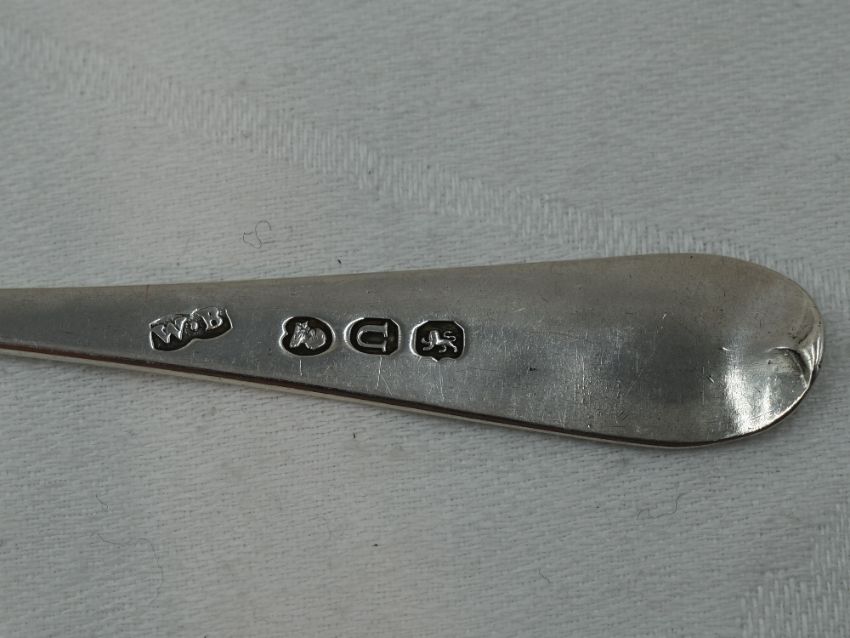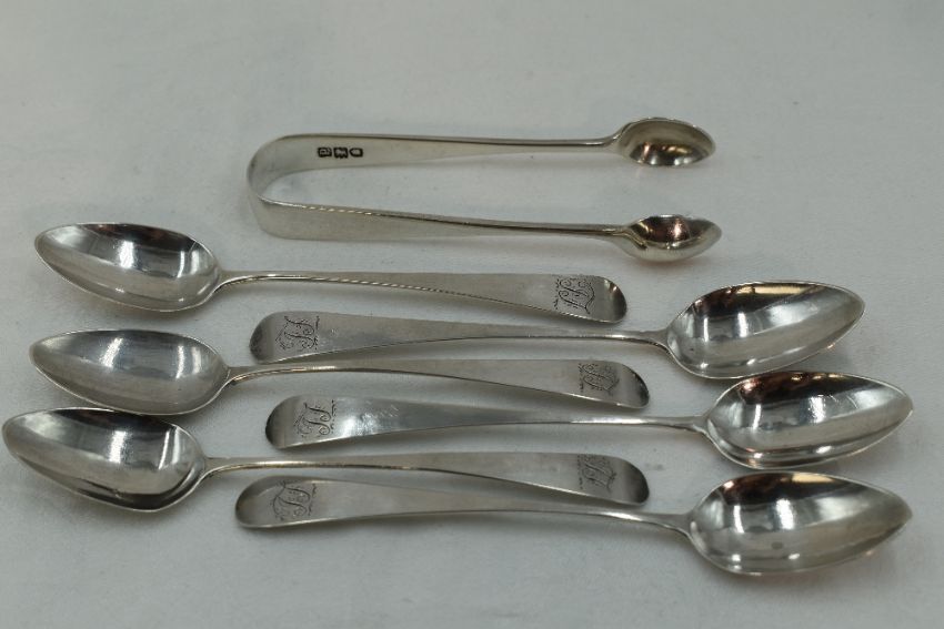 A set of six Georgian silver teaspoons of old English form bearing monogram to terminals, London 1815, William Bateman, and a Victorian pair of silver sugar nips, London 1900, Josiah Williams & Co, approx 88g