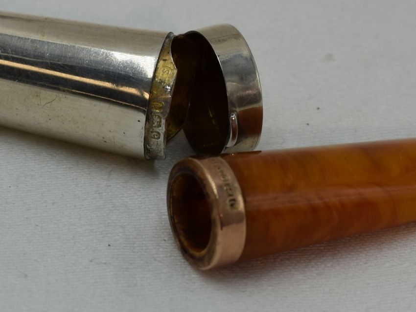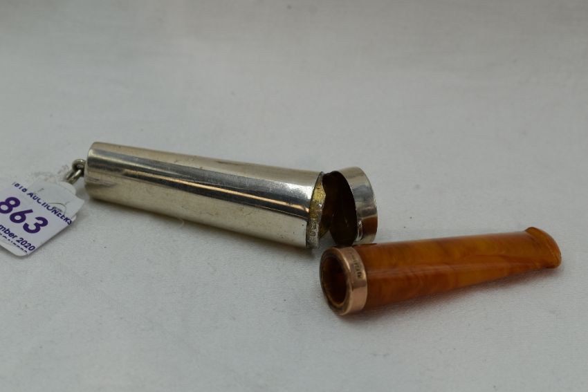 An Edwardian silver cigar holder case of plain form containing an amber cigar holder with 9ct rose gold rim, Birmingham 1904, Samuel M Levi