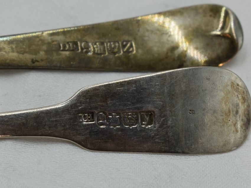 A Georgian Scottish silver table spoon of Old English form bearing monogram to terminal, Edinburgh 1831,maker DF, possibly Donald Fraser Inverness, and a similar table fork of fiddle back form bearing monogram and embossed scallop shell to terminal, Edinburgh 1830, J Hay
