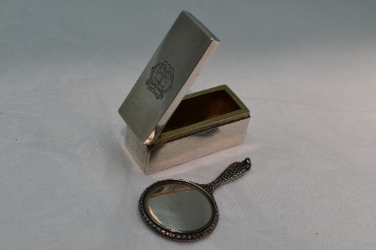 A miniature silver backed hand mirror having plannished decoration, Birmingham 1913, Crisford & Norris Ltd, and a white metal hinged box of plain rectangular form bearing monogram HBB to lid, no marks tested as silver