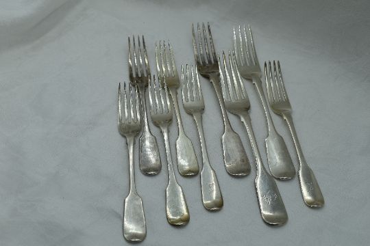 A selection of Victorian and Georgian silver table and dessert forks of fiddle back form, London 1826/42/49/69/62/65, mixed makers including Elizabeth & John Eaton, Elizabeth Eaton, H J Lias & Son, Joseph & Albert Savory etc