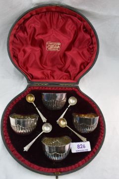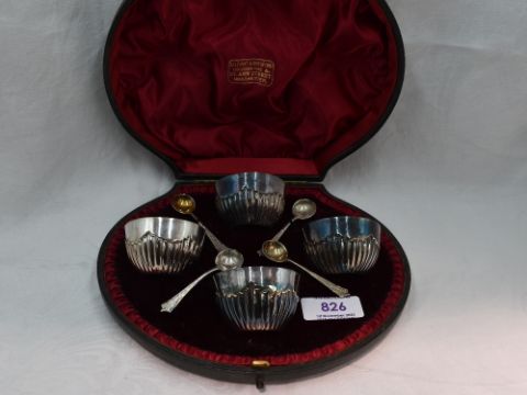 weight approx 148.8g. spoons and bowls all by same maker so no reason to think that spoons are not original. salts are in good condition but tarnished, some wear to spoon bowls and case has age related wear
