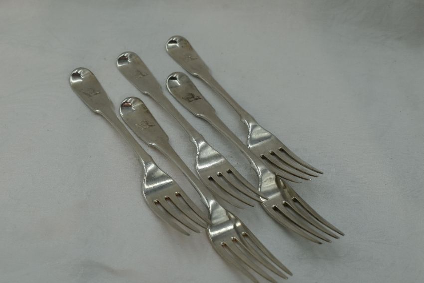 Five Georgian silver table forks of fiddle back form bearing unicorn crest to terminals, London 1801, William Sumner I, approx 379g