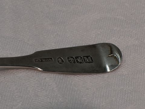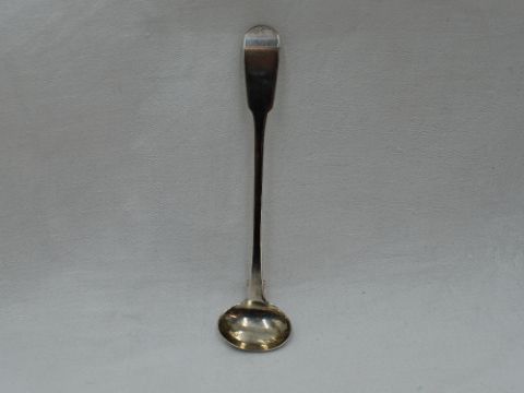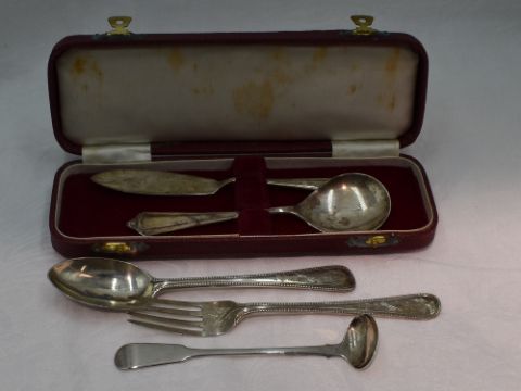 A Georgian Scottish silver condiment ladle, Glasgow 1831, John Heron of Greenock, a Victorian silver child's spoon and fork having engraved decoration, London 1875, William Hunter, and a cased silver sugar spoon and butter knife, Birmingham 1970/71, Deakin & Francis