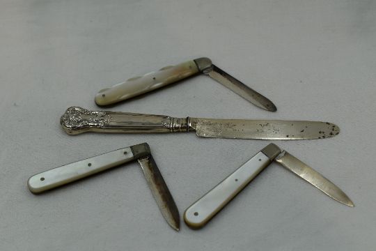 Two Edwardian folding fruit knives having HM silver blades and mother of pearl handles, a similar mid 20th century one with HM silver blade and mother of pearl handle, and a Georgian silver dessert knife having moulded handle and plain blade, makers mark IT