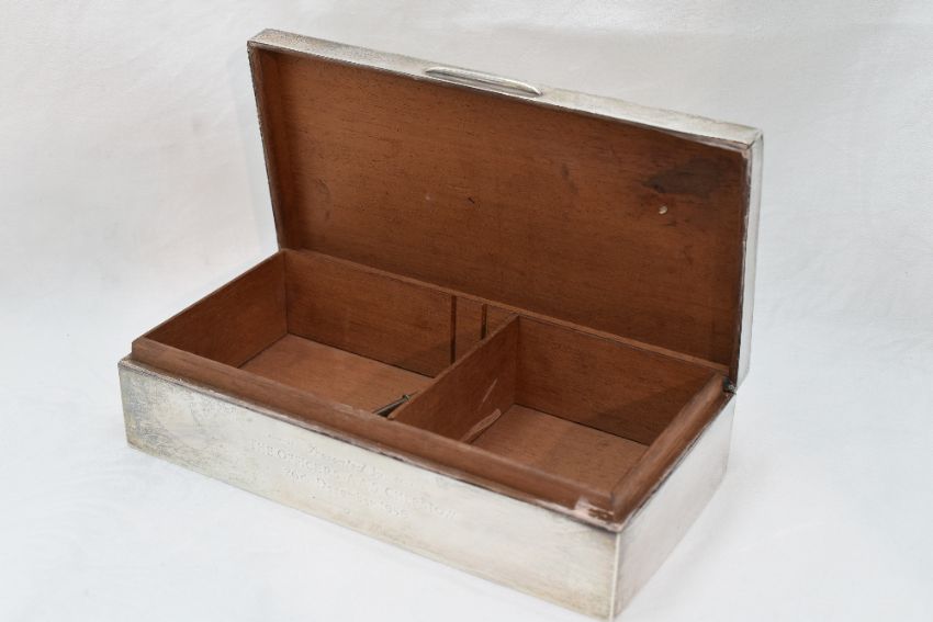 A silver cigarette case having engine turned decoration to lid with monogrammed cartouche and presentation inscription to side, Birmingham 1959, E & N Speak