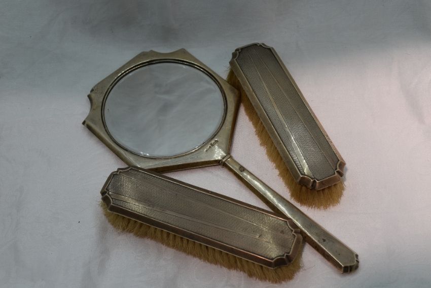 A silver dressing table hand mirror and two clothes brushes all having engine turned decoration, Birmingham 1936, S Blanckensee & Son Ltd