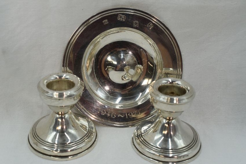 A silver replica Armada dish having over sized hallmarks and date inscription, London 1971, William Comyns & Sons ltd, and a pair of candle sticks of squat form having reeded decoration and weighted bases, Birmingham, 1965, W I Broadway & Co