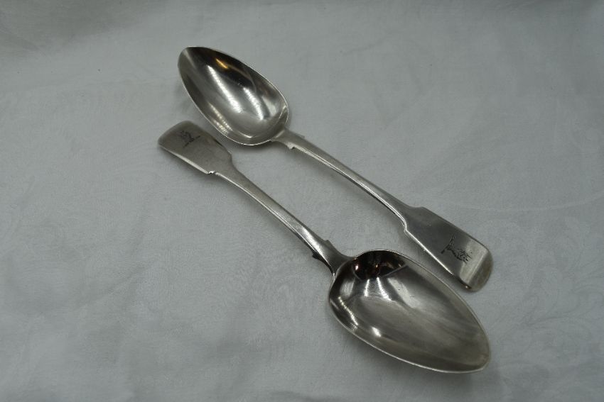 A pair of Georgian silver tablespoons fiddle back form bearing Griffin crest to terminals, Exeter 1824, William Welch II, approx 136.5g