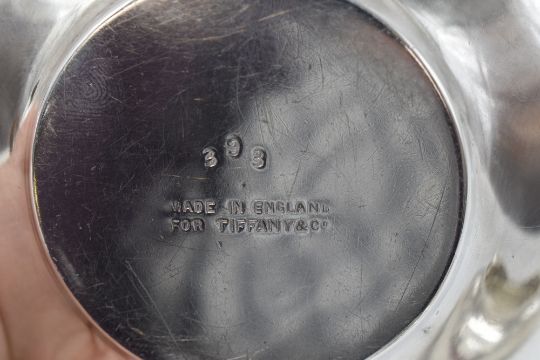 A silver three piece silver breakfast set of plain compressed circular form having wicker handle and turned wood knop, marked Made in England for Tiffany & Co to bases, London 1911/12, approx 656.6g