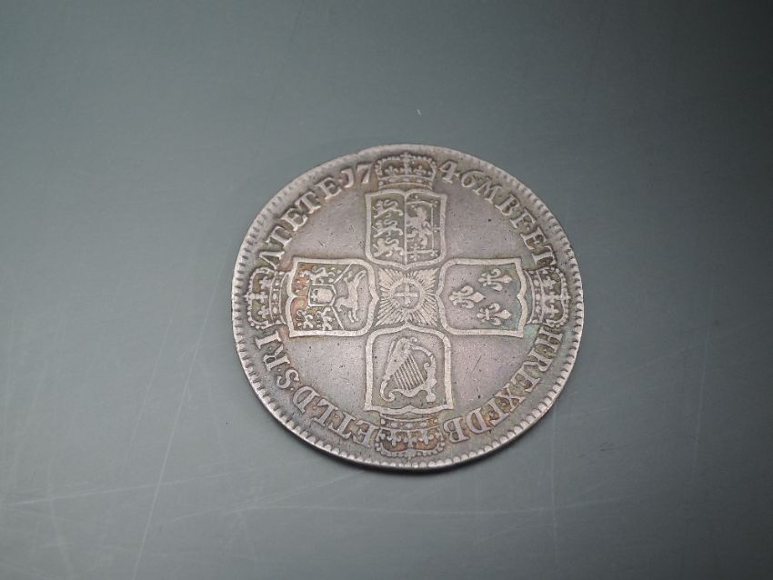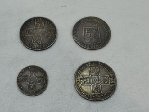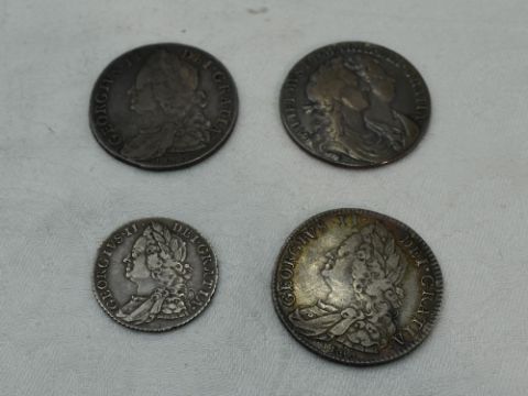 Four UK Coins, William & Mary 1689 Half Crown, George II 1746 Half Crown x2 and a George II 1758 Shilling