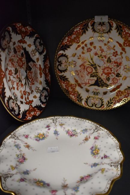 Three Royal Crown Derby plates, two having Imari pallet and the other having fluted edges,delicate floral pattern and gilt edge.