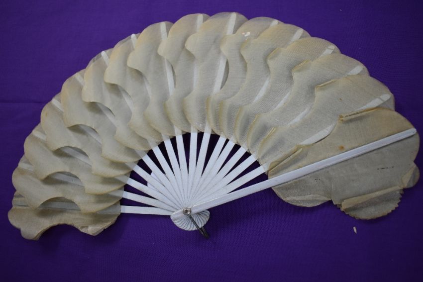 A Victorian fan having hand painted floral paper and gauze like leaves with gilt detailing and wooden ribs.