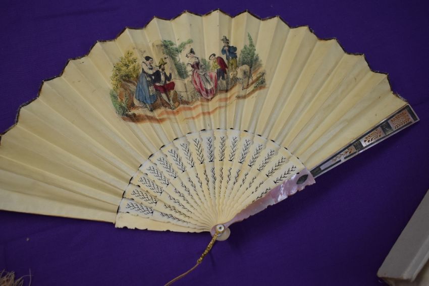 A hand coloured French fan, circa 1840, with lithographic classical scene to front and country family scene to reverse, pierced bone ribs and mother of pearl, a silk lined box is included.