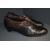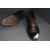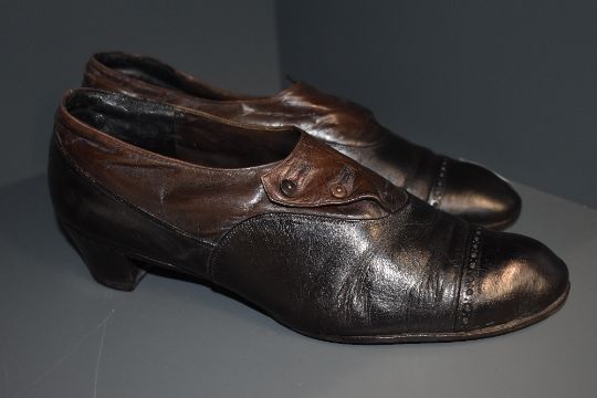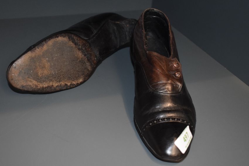 A pair of antique black and brown leather boots having buttons to sides and stack heel, around a UK size 7.