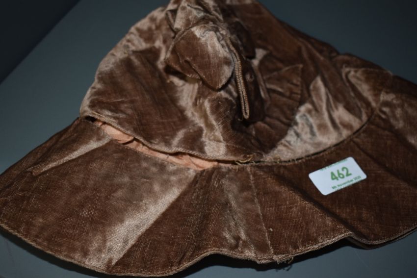 An art deco beige velvet cloche hat with bow detail to side.