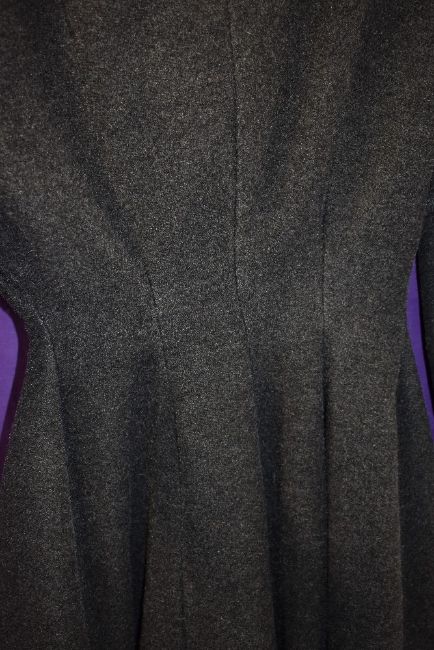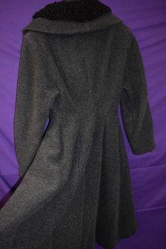 A ladies early 1950s fit and flare coat in grey wool with astrakhan collar,faux double breasted front and label reading Tweedtex coats.