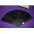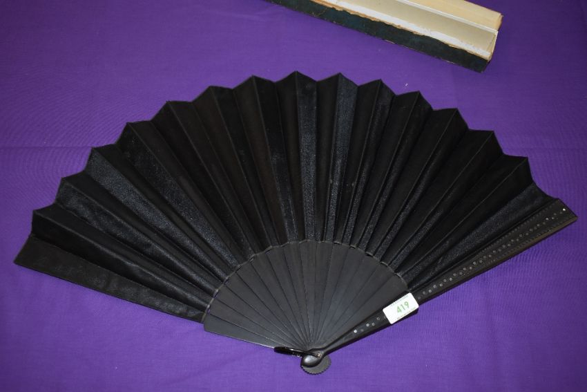 A large boxed early 20th century black silk fan with sequins and spangles forming butterflies to the front, black wooden ribs inlaid with small discs of metal.
