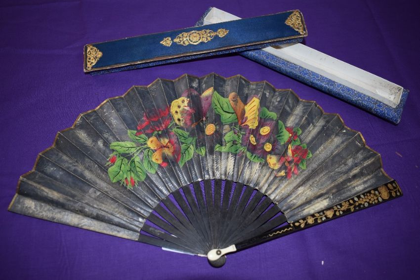 An early 19th century fan, thought to be for the Chinese export market having hand painted scenes to front on gold paper and silver to back, painted wooden ribs and bone thumb guards,A silk top case is included.