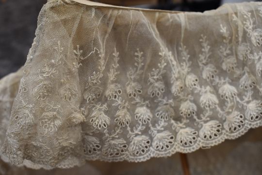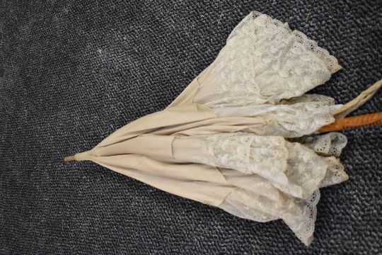 An early 20th century cream slub silk parasol with an abundance of tulle lace surrounding the edge, carved wooden handle and original case.