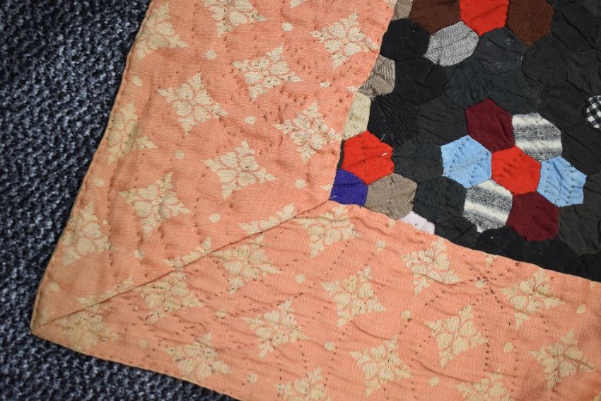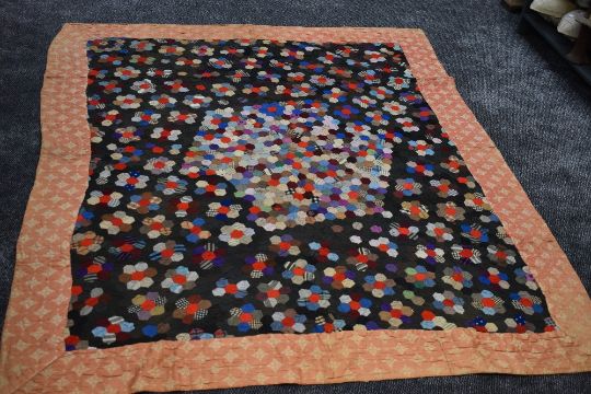A stunning Victorian patchwork quilt having hexagons to centre surrounded by a border. beautifully made and very crisp and bright,around a double or king size.