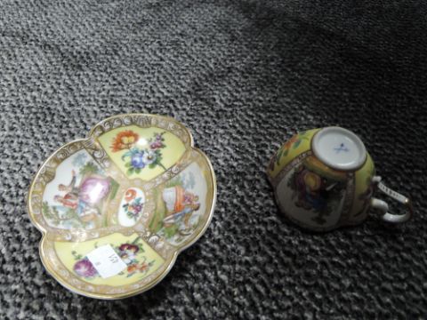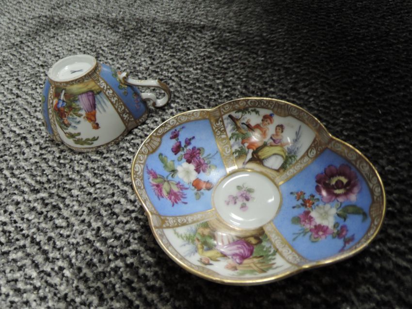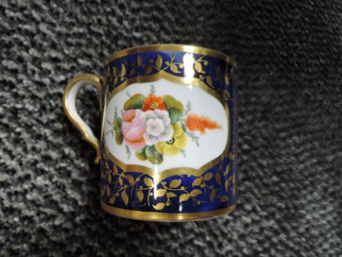 A fine selection of antique and later tea and coffee cups including Crown Derby Rockingham style and Meissen chocolate cup and saucer