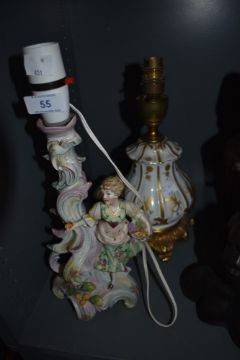 Two ceramic lamp bases including hard paste figural hand decorated and similar squat with gold decoration