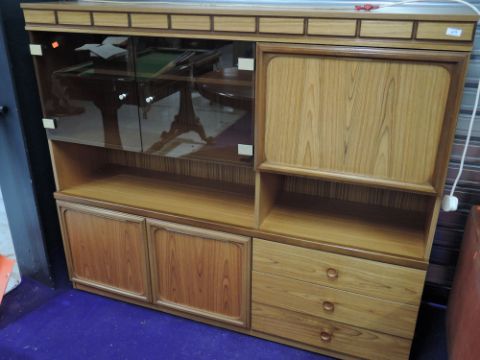 A vintage teak effect laminate wall unit, dimensions approx. W150cm H130cm
