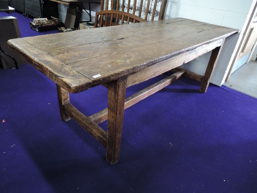 A rustic stained kitchen table, of primitive design, approx. 210 x 77cm ,seems generally sound