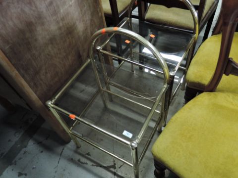 A pair of modern brass bedside or side table, having glass top and undertier, each width approx. 45cm