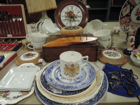 A selection of ceramics and curios including white glaze tea cup and saucer sets