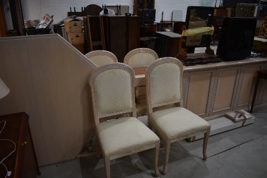 A modern octagonal table chairs and sideboard, gloss finish limed oak and peach effect, sideboard length approx. 207cm