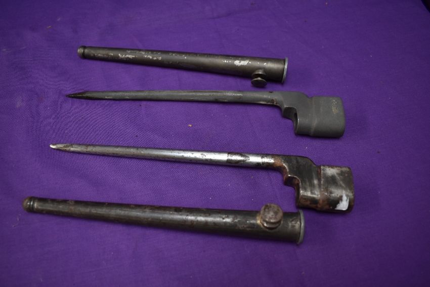 A British WW2 Bayonet, No4 Rifles No4 MK2 C1940, makers marks for Singer Manufacturing Co, with scabbard and A British WW2 Bayonet, No4 Rifles No4 MK2 C1940, with scabbard