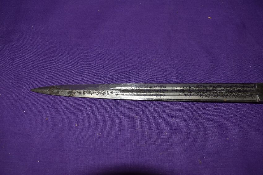 A German WW2 period Kriegsmarine Dagger with scabbard by Puma Solingen handle chipped two small dents on scabbard E Bahrmann on scabbard