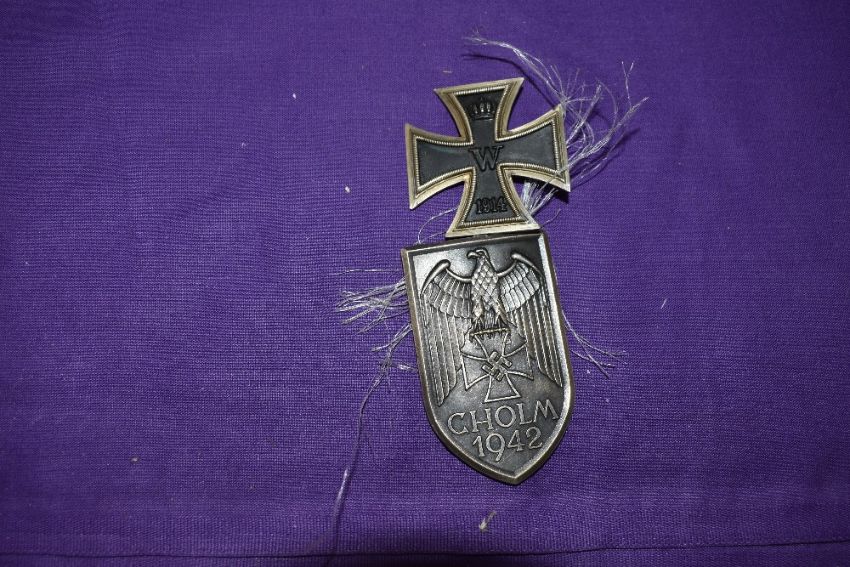 A German WW1 Iron Class first class dated 1914 and a German WW2 Cholm 1942 Shield with eagle and swastika decoration