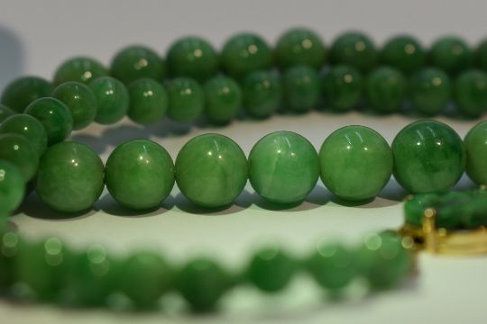 Four vintage strings of beads including a short string of Lapis Lazuli, green marble, jadeite style beads with yellow metal clasp stamped 15ct etc