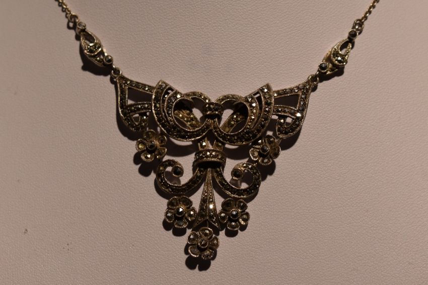 A selection of vintage marcasite jewellery, most stamped silver including a necklace on fixed chain, bracelet, collar clips etc