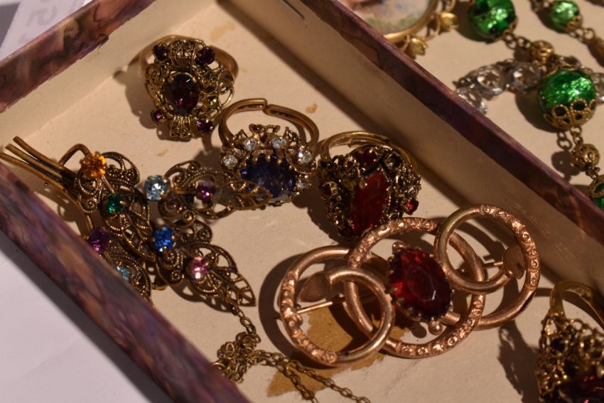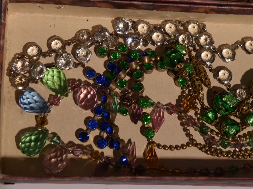 A selection of vintage costume jewellery including glass and crystal beads, glass locket, Italian mosaic brooch etc