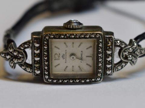 A lady's continental silver cocktail watch by Bucherer stamped 800 having a baton numeral face in a marcasite decorated case on a leather cord strap, and a base metal cocktail watch of similar form