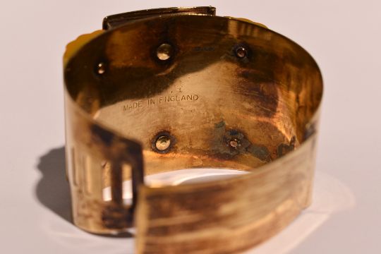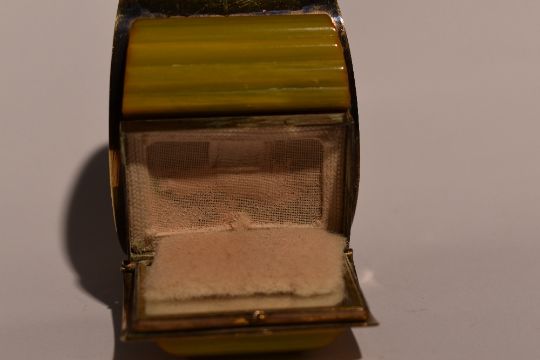 An Art Deco brass and amber style celluloid bangle having a hinged powder compartment to top and a hinged tension clasp, stamped Made in England to reverse