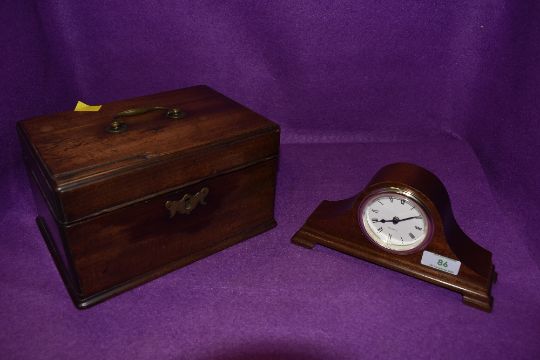 An antique mahogany veneered tea caddy having three internal compartments and a small Mahogany mantle clock.