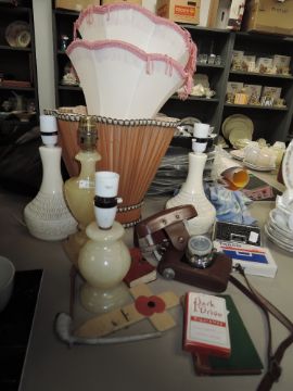 A selection of vintage lamps and shades,Tasco Binoculars, a Halina camera,Park Drive advertising playing cards and more.