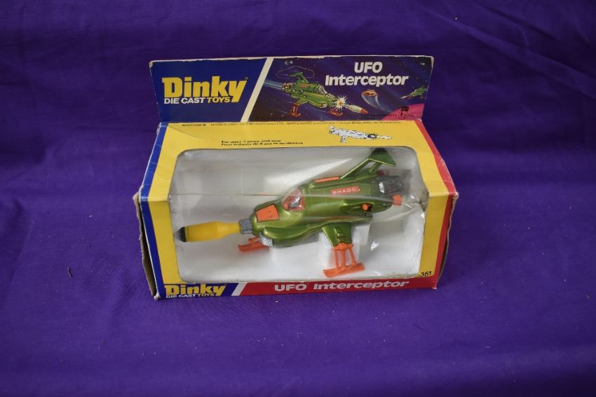 A Dinky diecast, UFO Interceptor, with rocket, on polystyrene stand in window display box 351