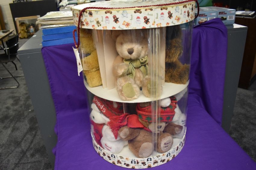 A Harrods Ten Teddies Presentation Set, 1986-1995, missing 1993 bear, nine bears present, in original circular two tier display plastic case