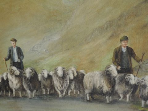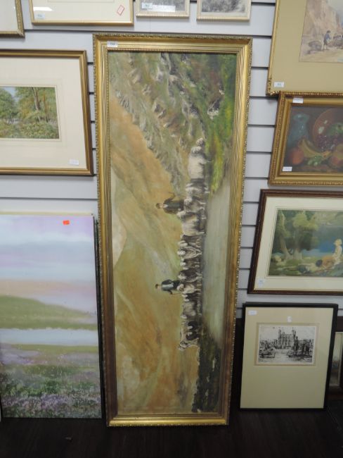 An oil painting, Audle, hill shepherd, indistinctly signed, 45 x 147cm, framed