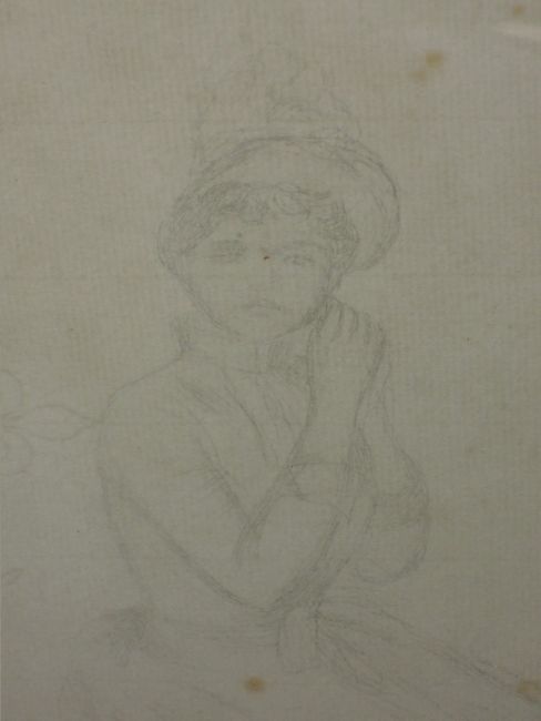 A pencil sketch, CR, lady in 18th century dress, monogrammed, 25 x 17cm, framed and glazed