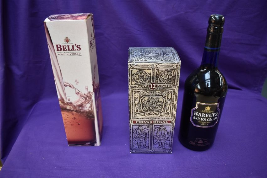 A bottle of Chivas Regal 12 Year Old Whisky 26 2/3 Fl Oz 75% proof, a bottle of Bells 8 year old Whisky and a bottle of Harveys Bristol Cream Sherry 1L