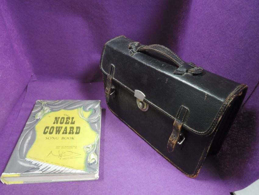 A selection of piano sheet music and Noel Coward song book with leather bound satchel