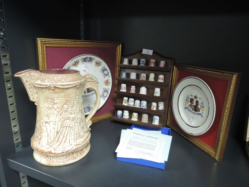 A mixed lot containing a collection of thimbles in display stand 'thimbles of the worlds greatest porcelain houses' with a quantity of certificates also included are two commemorative plates and similar Burleigh ware jug.