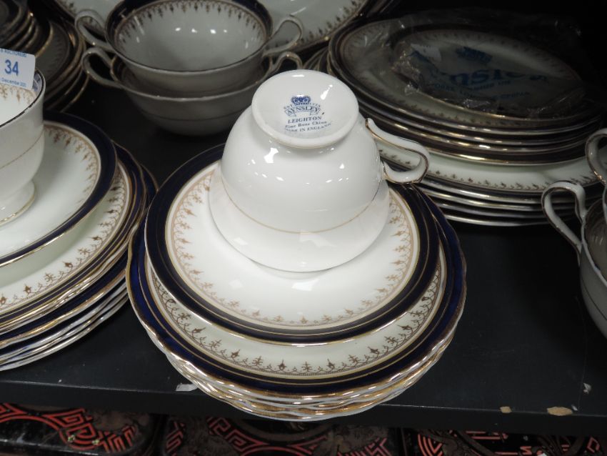 A part Aynsley Leighton dinner service having white ground with royal blue edge and gilt motif included are soup bowls,cups and saucers plates and platters, around forty one items.